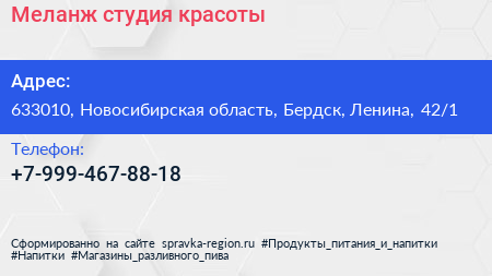 Меланж, студия красоты по адресу 633010, Новосибирская область, Бердск, Ленина, 42/1 в дальнейшем Организация, размещена в следующих категориях: