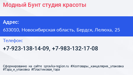 Модный Бунт, студия красоты по адресу 633010, Новосибирская область, Бердск, Лелюха, 25 в дальнейшем Организация, размещена в следующих категориях: