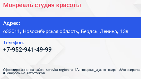 Монреаль, студия красоты по адресу 633011, Новосибирская область, Бердск, Ленина, 13в в дальнейшем Организация, размещена в следующих категориях: