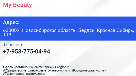 My Beauty по адресу 633009, Новосибирская область, Бердск, Красная Сибирь, 119 в дальнейшем Организация, размещена в следующих категориях: