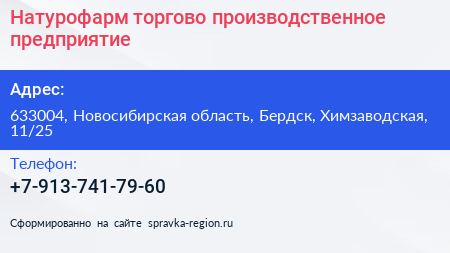 Натурофарм, торгово-производственное предприятие по адресу 633004, Новосибирская область, Бердск, Химзаводская, 11/25 в дальнейшем Организация, размещена в следующих категориях: