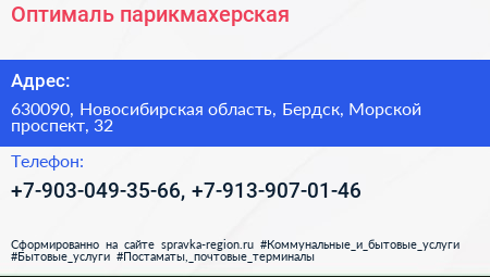 Оптималь, парикмахерская по адресу 630090, Новосибирская область, Бердск, Морской проспект, 32 в дальнейшем Организация, размещена в следующих категориях: