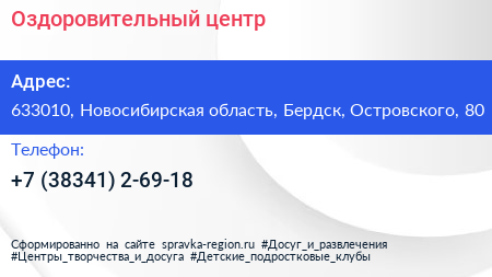 Оздоровительный центр по адресу 633010, Новосибирская область, Бердск, Островского, 80 в дальнейшем Организация, размещена в следующих категориях: