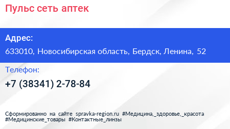 Пульс, сеть аптек по адресу 633010, Новосибирская область, Бердск, Ленина, 52 в дальнейшем Организация, размещена в следующих категориях: