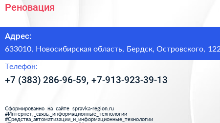 Реновация по адресу 633010, Новосибирская область, Бердск, Островского, 122 в дальнейшем Организация, размещена в следующих категориях: