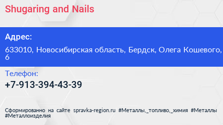 Shugaring and Nails по адресу 633010, Новосибирская область, Бердск, Олега Кошевого, 6 в дальнейшем Организация, размещена в следующих категориях: