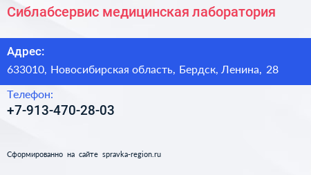 Сиблабсервис, медицинская лаборатория по адресу 633010, Новосибирская область, Бердск, Ленина, 28 в дальнейшем Организация, размещена в следующих категориях: