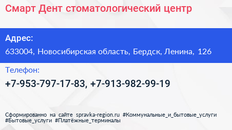 Смарт-Дент, стоматологический центр по адресу 633004, Новосибирская область, Бердск, Ленина, 126 в дальнейшем Организация, размещена в следующих категориях: