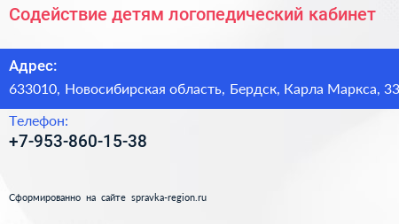 Содействие детям, логопедический кабинет по адресу 633010, Новосибирская область, Бердск, Карла Маркса, 33 в дальнейшем Организация, размещена в следующих категориях: