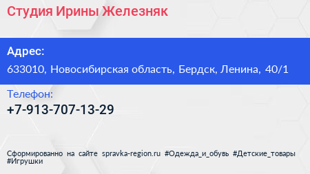 Студия Ирины Железняк по адресу 633010, Новосибирская область, Бердск, Ленина, 40/1 в дальнейшем Организация, размещена в следующих категориях: