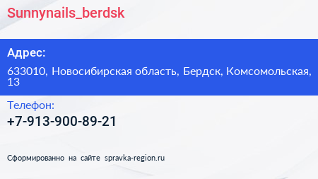 Sunnynails_berdsk по адресу 633010, Новосибирская область, Бердск, Комсомольская, 13 в дальнейшем Организация, размещена в следующих категориях: