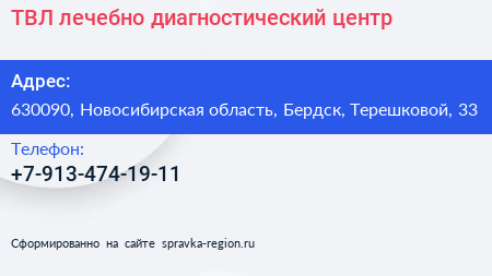 ТВЛ, лечебно-диагностический центр по адресу 630090, Новосибирская область, Бердск, Терешковой, 33 в дальнейшем Организация, размещена в следующих категориях: