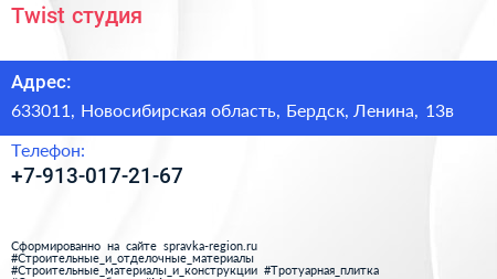 Twist, студия по адресу 633011, Новосибирская область, Бердск, Ленина, 13в в дальнейшем Организация, размещена в следующих категориях: