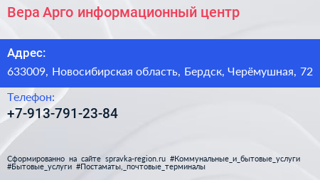 Вера-Арго, информационный центр по адресу 633009, Новосибирская область, Бердск, Черёмушная, 72 в дальнейшем Организация, размещена в следующих категориях: