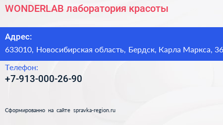 WONDERLAB, лаборатория красоты по адресу 633010, Новосибирская область, Бердск, Карла Маркса, 36 в дальнейшем Организация, размещена в следующих категориях: