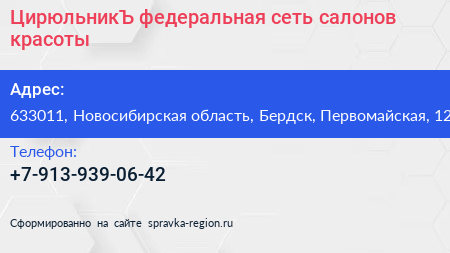 ЦирюльникЪ, федеральная сеть салонов красоты по адресу 633011, Новосибирская область, Бердск, Первомайская, 12 в дальнейшем Организация, размещена в следующих категориях: