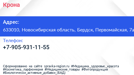 Крона по адресу 633010, Новосибирская область, Бердск, Первомайская, 7а в дальнейшем Организация, размещена в следующих категориях: