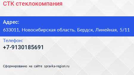СТК, стеклокомпания по адресу 633011, Новосибирская область, Бердск, Линейная, 5/11 в дальнейшем Организация, размещена в следующих категориях: