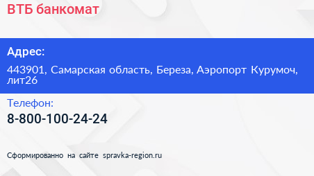 ВТБ, банкомат по адресу 443901, Самарская область, Береза, Аэропорт Курумоч, лит26 в дальнейшем Организация, размещена в следующих категориях: