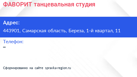 ФАВОРИТ, танцевальная студия по адресу 443901, Самарская область, Береза, 1-й квартал, 11 в дальнейшем Организация, размещена в следующих категориях: