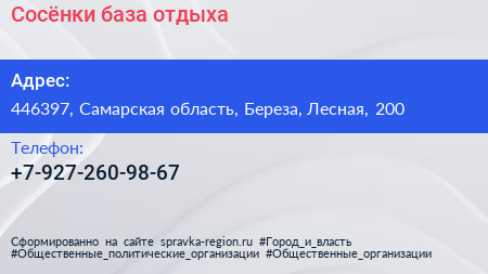 Сосёнки, база отдыха по адресу 446397, Самарская область, Береза, Лесная, 200 в дальнейшем Организация, размещена в следующих категориях: