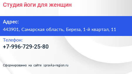 Студия йоги для женщин по адресу 443901, Самарская область, Береза, 1-й квартал, 11 в дальнейшем Организация, размещена в следующих категориях: