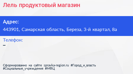 Лель, продуктовый магазин по адресу 443901, Самарская область, Береза, 3-й квартал, 8а в дальнейшем Организация, размещена в следующих категориях: