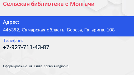 Сельская библиотека, с. Молгачи по адресу 446392, Самарская область, Береза, Гагарина, 108 в дальнейшем Организация, размещена в следующих категориях: