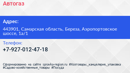 Автогаз по адресу 443901, Самарская область, Береза, Аэропортовское шоссе, 1а/1 в дальнейшем Организация, размещена в следующих категориях: