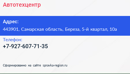 Автотехцентр по адресу 443901, Самарская область, Береза, 5-й квартал, 10а в дальнейшем Организация, размещена в следующих категориях:
