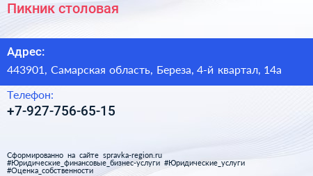 Пикник, столовая по адресу 443901, Самарская область, Береза, 4-й квартал, 14а в дальнейшем Организация, размещена в следующих категориях: