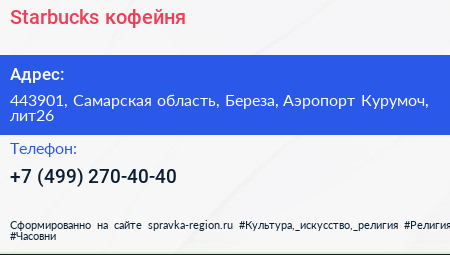 Starbucks, кофейня по адресу 443901, Самарская область, Береза, Аэропорт Курумоч, лит26 в дальнейшем Организация, размещена в следующих категориях:
