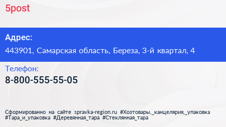 5post по адресу 443901, Самарская область, Береза, 3-й квартал, 4 в дальнейшем Организация, размещена в следующих категориях: