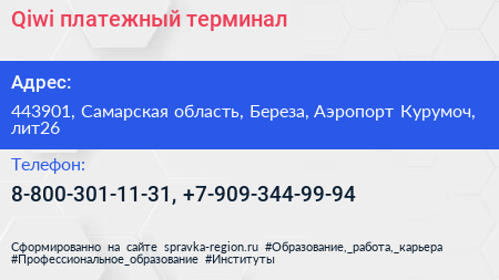 Qiwi, платежный терминал по адресу 443901, Самарская область, Береза, Аэропорт Курумоч, лит26 в дальнейшем Организация, размещена в следующих категориях: