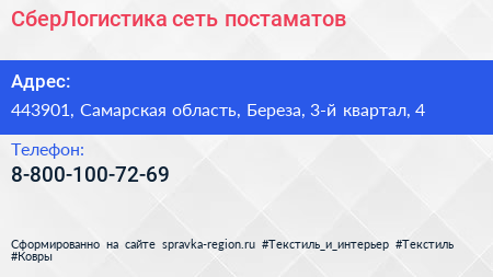 СберЛогистика, сеть постаматов по адресу 443901, Самарская область, Береза, 3-й квартал, 4 в дальнейшем Организация, размещена в следующих категориях: