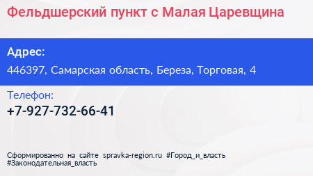 Фельдшерский пункт, с. Малая Царевщина по адресу 446397, Самарская область, Береза, Торговая, 4 в дальнейшем Организация, размещена в следующих категориях: