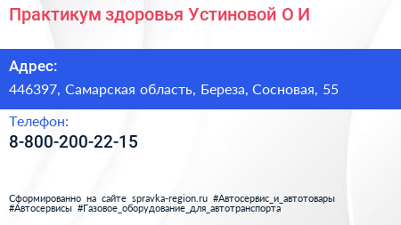 Практикум здоровья Устиновой О.И. по адресу 446397, Самарская область, Береза, Сосновая, 55 в дальнейшем Организация, размещена в следующих категориях: