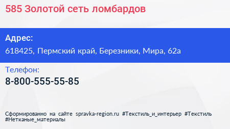 585*Золотой, сеть ломбардов по адресу 618425, Пермский край, Березники, Мира, 62а в дальнейшем Организация, размещена в следующих категориях: