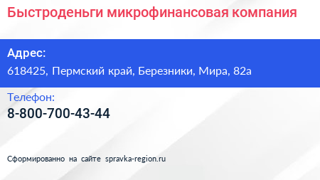 Быстроденьги, микрофинансовая компания по адресу 618425, Пермский край, Березники, Мира, 82а в дальнейшем Организация, размещена в следующих категориях: