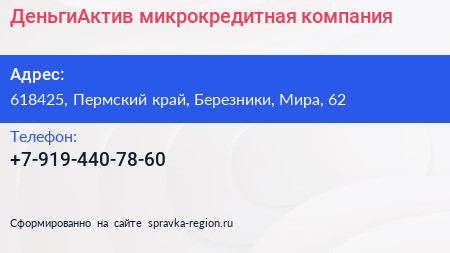 ДеньгиАктив, микрокредитная компания по адресу 618425, Пермский край, Березники, Мира, 62 в дальнейшем Организация, размещена в следующих категориях: