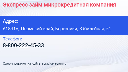 Экспресс займ, микрокредитная компания по адресу 618416, Пермский край, Березники, Юбилейная, 51 в дальнейшем Организация, размещена в следующих категориях: