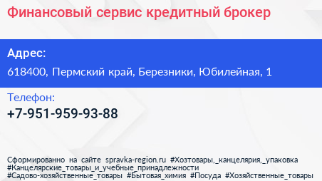 Финансовый сервис, кредитный брокер по адресу 618400, Пермский край, Березники, Юбилейная, 1 в дальнейшем Организация, размещена в следующих категориях:
