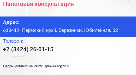Налоговая консультация по адресу 618419, Пермский край, Березники, Юбилейная, 32 в дальнейшем Организация, размещена в следующих категориях: