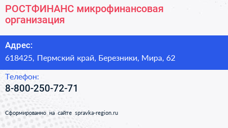 РОСТФИНАНС, микрофинансовая организация по адресу 618425, Пермский край, Березники, Мира, 62 в дальнейшем Организация, размещена в следующих категориях:
