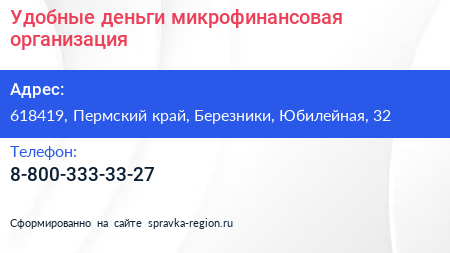 Удобные деньги, микрофинансовая организация по адресу 618419, Пермский край, Березники, Юбилейная, 32 в дальнейшем Организация, размещена в следующих категориях:
