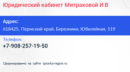 Юридический кабинет Митраковой И.В. по адресу 618425, Пермский край, Березники, Юбилейная, 119 в дальнейшем Организация, размещена в следующих категориях: