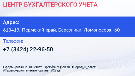 ЦЕНТР БУХГАЛТЕРСКОГО УЧЕТА по адресу 618419, Пермский край, Березники, Ломоносова, 60 в дальнейшем Организация, размещена в следующих категориях: