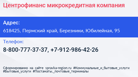 Центрофинанс, микрокредитная компания по адресу 618425, Пермский край, Березники, Юбилейная, 95 в дальнейшем Организация, размещена в следующих категориях: