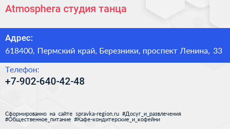 Atmosphera, студия танца по адресу 618400, Пермский край, Березники, проспект Ленина, 33 в дальнейшем Организация, размещена в следующих категориях: