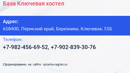 База Ключевая, хостел по адресу 618400, Пермский край, Березники, Ключевая, 51Б в дальнейшем Организация, размещена в следующих категориях: